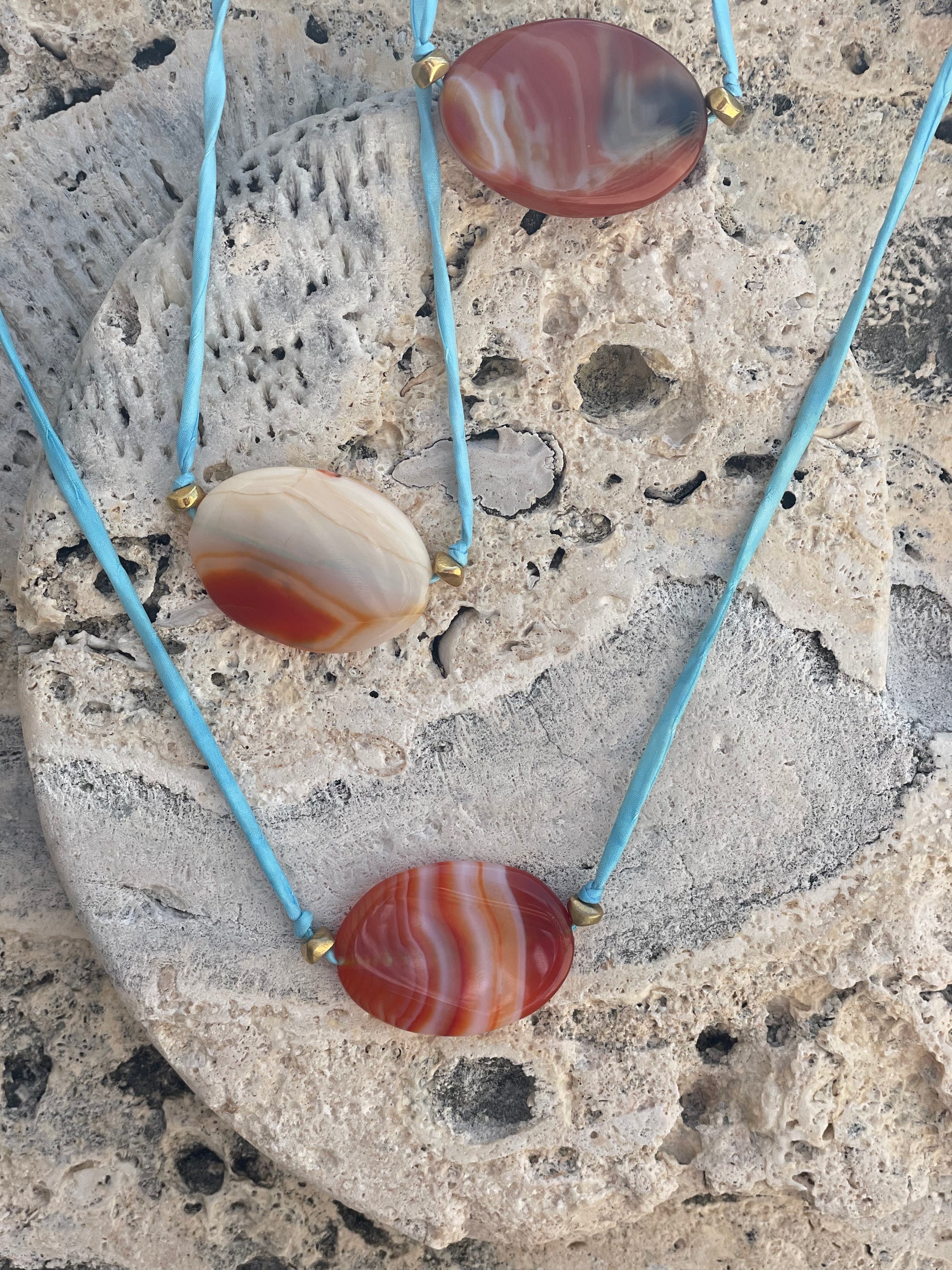 Crafted with fire agate, a stone of grounded courage and creative ignition, and wrapped in ocean-blue silk to soothe the nervous system and clarify your inner voice.