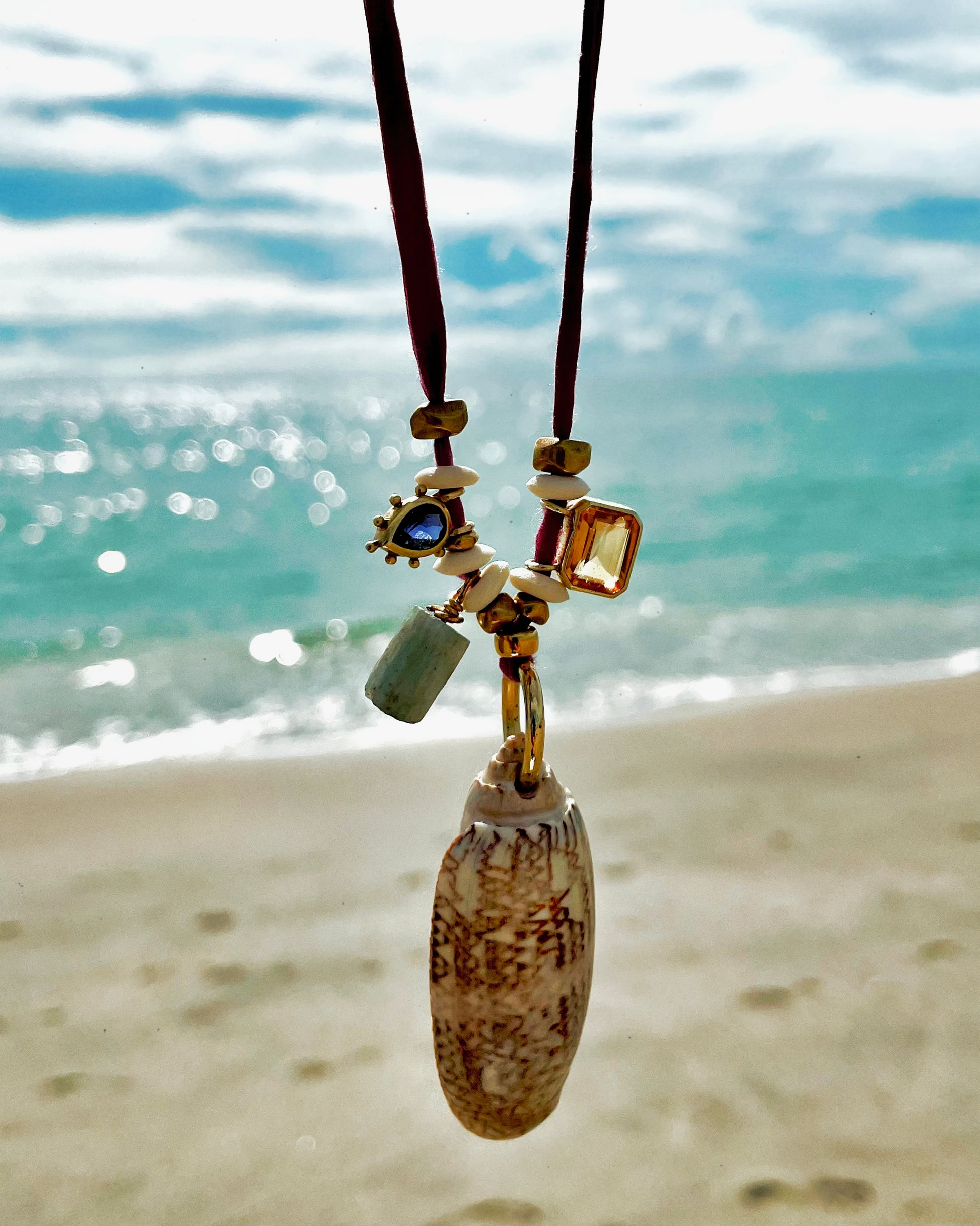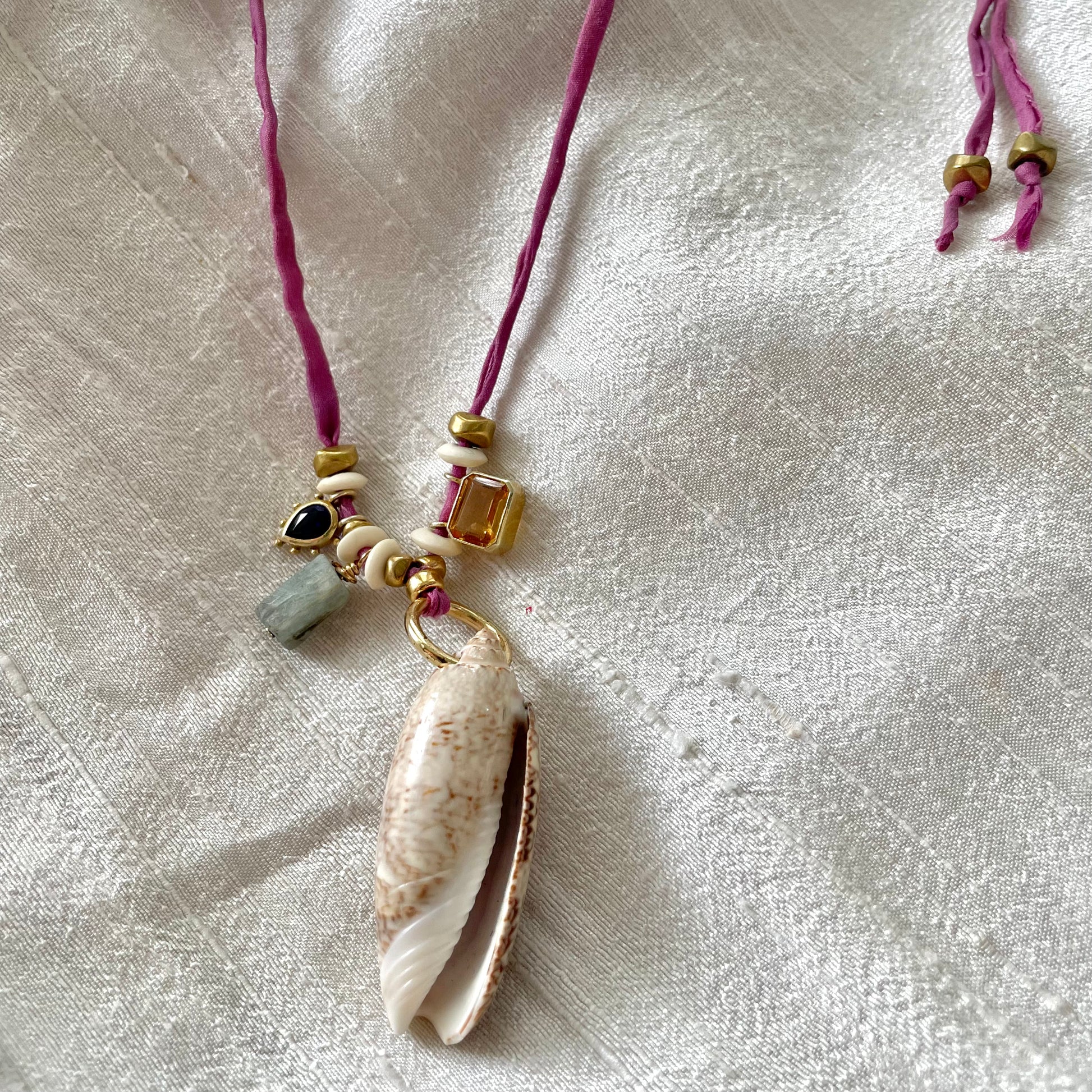 Iolite · Kyanite · Shell · Citrine · Reclaimed Bone on Hand-Dyed Silk